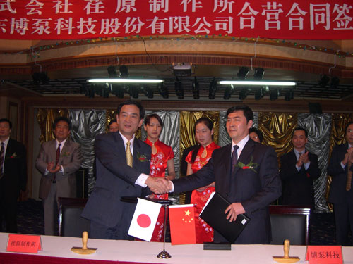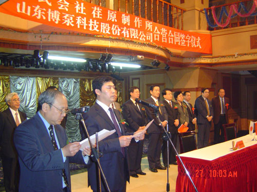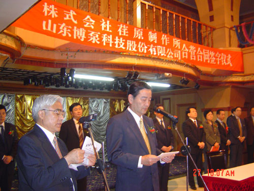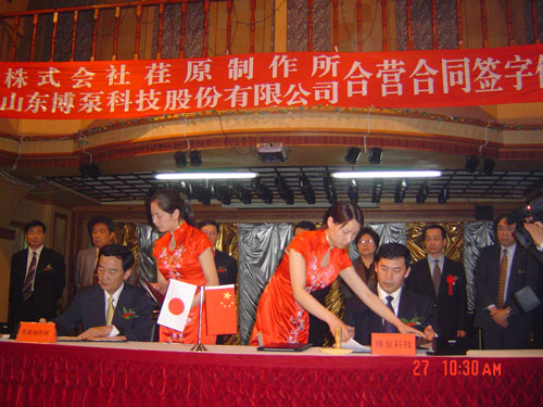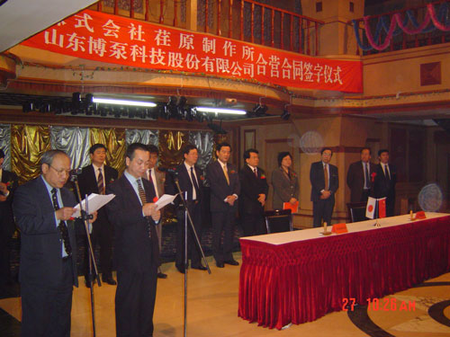 新聞中心 2005年4月27日,在博山萬杰國(guó)際大酒店山東博泵科技股份有限公司與日本株式會(huì)社荏原制作所正式簽署了注冊(cè)資本1100萬美元的合營(yíng)公司――荏原博泵有限責(zé)任公司。該公司的建立將通過引進(jìn)世界最大的泵企業(yè)――日本株式會(huì)社荏原制作所的先進(jìn)技術(shù),加快大型泵、高壓泵國(guó)產(chǎn)化進(jìn)程,建成具有國(guó)際競(jìng)爭(zhēng)力的一流企業(yè)。為中國(guó)水電、核電及超臨界火電項(xiàng)目,為南水北調(diào)等大型水力工程提供高質(zhì)量、高技術(shù)含量的一流泵產(chǎn)品,提升中國(guó)機(jī)械工業(yè)技術(shù)、質(zhì)量水平,促進(jìn)產(chǎn)品更新?lián)Q代,為中國(guó)電力、冶金、水力事業(yè)的發(fā)展乃至中國(guó)國(guó)民經(jīng)濟(jì)的發(fā)展做出應(yīng)有的貢獻(xiàn)。
