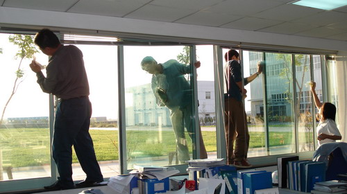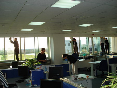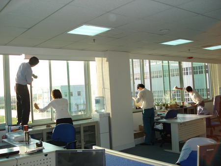 業(yè)務技術(shù)黨支部共32人參加勞動,支部書記梁文運與支委們首先對負責清理的二樓、四樓場所及會議室的窗戶和地面進行了詳細分工,使大家在有限的時間內(nèi)有條不紊的進行。特別是二樓只有13人參加勞動,衛(wèi)生清理工作量比較大,但大家都沒有任何怨言。在勞動中,鄭素紅、房凝、徐寶紅、牛愛香四位女同志連續(xù)工作一個半小時打掃了二樓的所有辦公室和會議室的地面。李正民副總和李同華副總率先帶頭擦起了窗戶,在擦完窗戶后大家又把所有的窗臺和地面的衛(wèi)生死角清理了一遍。